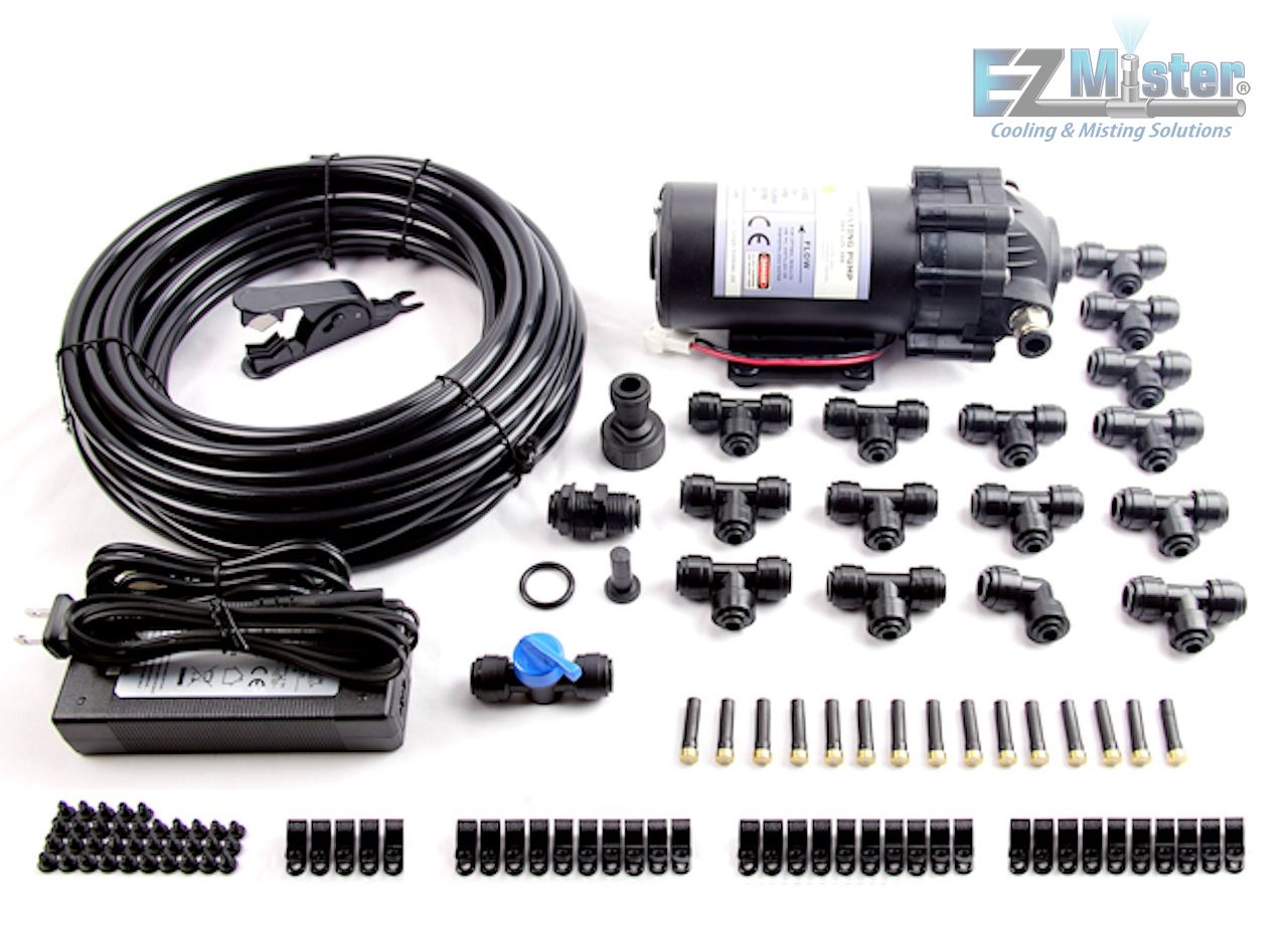 General This is an upgraded version of the Flex-basic. Manually operated system. You have to turn on the pump, then turn on the water. With pressure boosted up to 125 psi with the included MistKing pump, you will enjoy a much fuller mist from the nozzles. This system is ideally suited to be connected to a reservoir or pressurized source and is meant to be manually turned ON and OFF. |